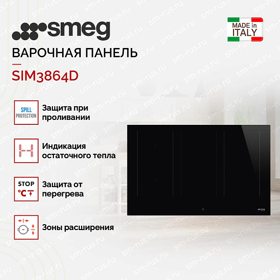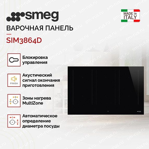 Варочная панель Smeg SIM3864D выполнена в черном цвете в стиле Hi-Tech. Поверхность выполнена из стеклокерамики, Модель оборудована 6 индукционными конфорками, которые объединяются в 3 Multizone.