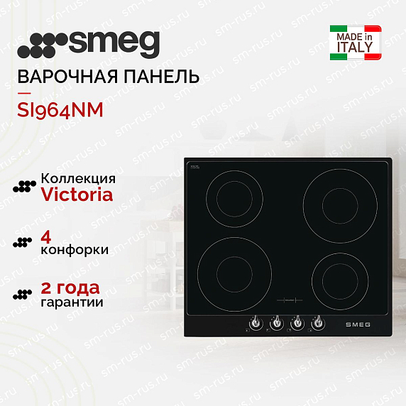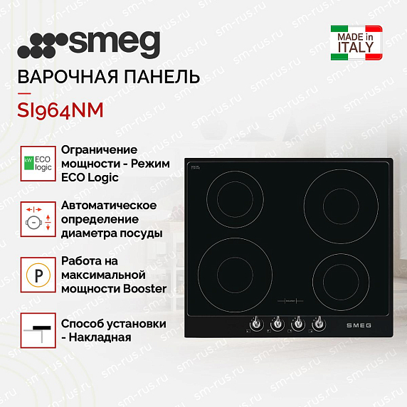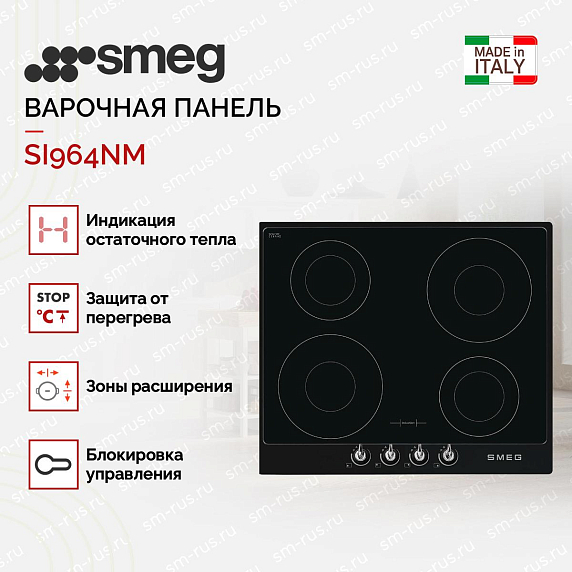 Варочная панель SMEG SI964NM выполнена из черной стеклокерамики. Плита защищена от перегрева и и изменения настроек во время готовки. Функция Eco-logic позволяет ограничить энергопотребление до 3 кВт. Оптимальных условий для приготовления любого продукта помогут добиться 9 уровней регуляции.