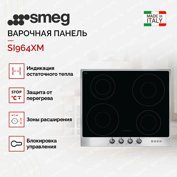 Варочная панель SMEG SI964XM обладает 4 индукционными зонами нагрева. Поворотные переключатели обеспечат легкую настройку мощности конфорки. Предусмотрена функция Booster, позволяющая очень быстро нагреть большой объем воды или жарить продукты на большой мощности.