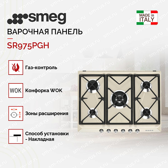 Smeg SR975PGH — элегантная варочная панель кремового цвета. Модель снабжена пятью газовыми горелками, одна из которых является ультрабыстрой и поддерживает раздельное управление контурами пламени. Высокопрочные чугунные решетки обеспечивают устойчивое размещение посуды.