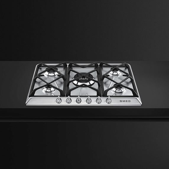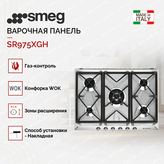 Smeg SR975XGH — варочная панель с основанием из матовой нержавеющей стали. Модель снабжена пятью газовыми горелками и дополнена чугунными решетками. Для удобства эксплуатации предусмотрена система автоматического электроподжига, обеспечивающая возможность управления устройством с помощью одной руки.