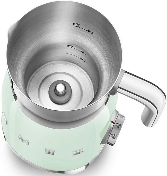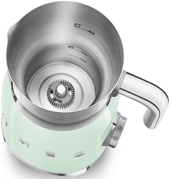 Вспениватель молока Smeg MFF01PGEU из серии «Стиль 50-х годов» выполнен в зеленом цвете и прекрасно дополнит любую кухню вместе с другой малой бытовой техникой бренда. Удобное управление позволяет быстро выбрать нужную программу, например — «Горячий шоколад» или «Холодное молоко с густой пеной». Корпус из нержавеющей стали и нескользящие ножки обеспечивают комфорт и долговечность использования.