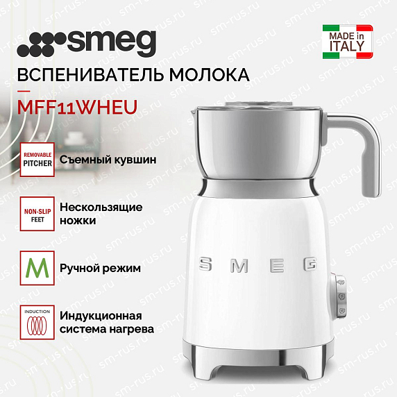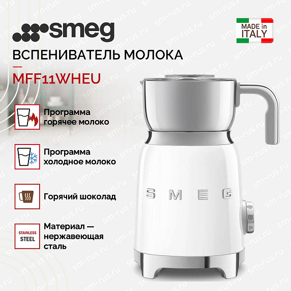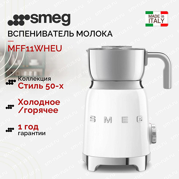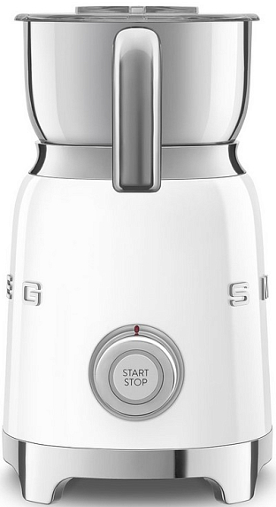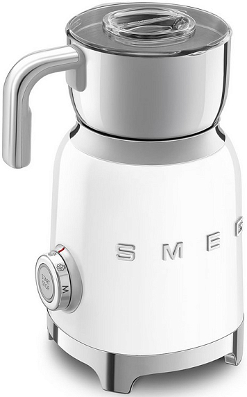 Вспениватель молока Smeg MFF11WHEU из серии «Стиль 50-х годов» выполнен в белом цвете и прекрасно дополнит любую кухню вместе с другой малой бытовой техникой бренда. Модель оснащена удобным управлением, при помощи которого можно быстро выбрать нужный режим, например — «Горячий шоколад». Для начала приготовления достаточно повернуть ручку и нажать на кнопку «Старт».