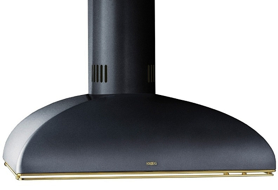 Вытяжка Smeg KSE89A2 представлена в эффектном сочетании позолоченной фурнитуры и лаконичного корпуса цвета «антрацит». Модель предназначена для работы на