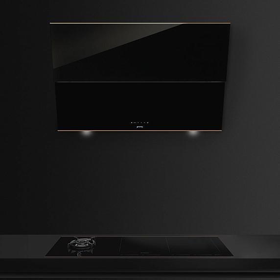 Вытяжка Smeg KSVV90NRA из коллекции Dolce Stil Novo выполнена из черного закаленного стекла и дополнена благородным медным профилем. Аспирация по периметру и интенсивный режим обеспечивают эффективную работу даже при обильных испарениях. Также вытяжка функционирует в режиме рециркуляции воздуха, при котором не требуется подключение к вентиляционному ходу. Специальные угольные фильтры приобретаются отдельно.