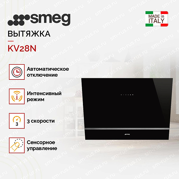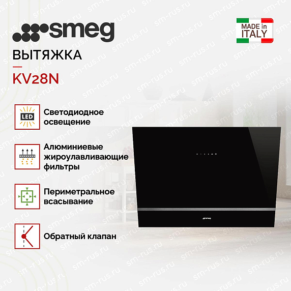 Вытяжка Smeg KV28N — эффектная наклонная модель из закаленного стекла. Устройство можно использовать в двух режимах: отвода и рециркуляции. Во втором случае помимо двух жироуловителей нужно установить еще один угольный фильтр. Благодаря антивозвратному клапану воздух, забранный из помещения, не возвращается обратно в кухню.